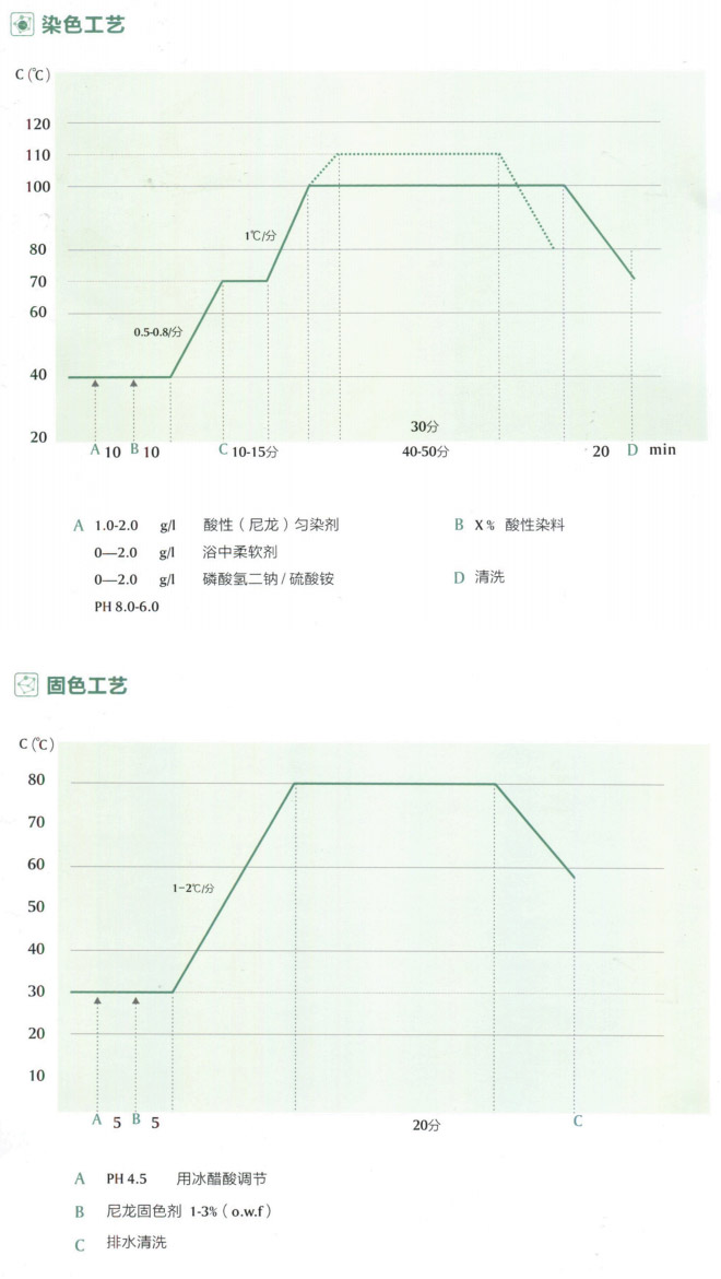 該產(chǎn)品屬于賽德倫E系列染料。該系列染料是高移染高牢度的金屬絡(luò)合染料,適合使用于極淺至中等深度染色。在不同染色深度,都有高等級的日曬牢度性能。高溫定型色變極小,特別適合內(nèi)衣面料的耐高溫壓模。淺色時(shí)可在PH=6-8左右染色。